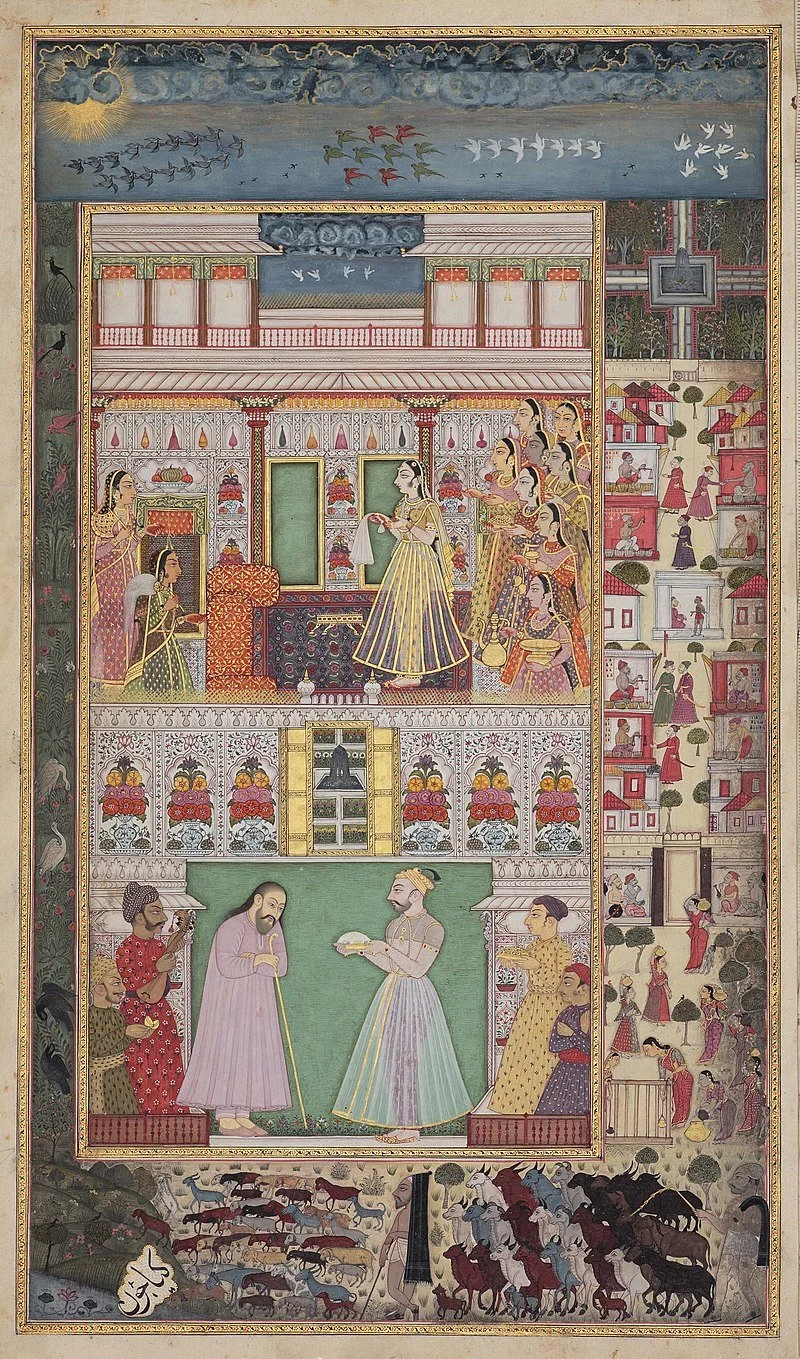 A scene from the Sufi mystic Nusrati’s Gulshan e-Ishq (The Rose Garden of Love) from a 1710 manuscript. In the upper panel, the queen resides, secluded in her private apartment, in Sophia-like wisdom (the divine feminine, or beloved held at a distance). In the lower panel, King Bikram, offers food to the holy man, Roshan e-Dil (meaning, “illumination of the heart.”), in a symbolic scene representing the union of ‘Aql (Reason) and ‘Esq (Divine Love).